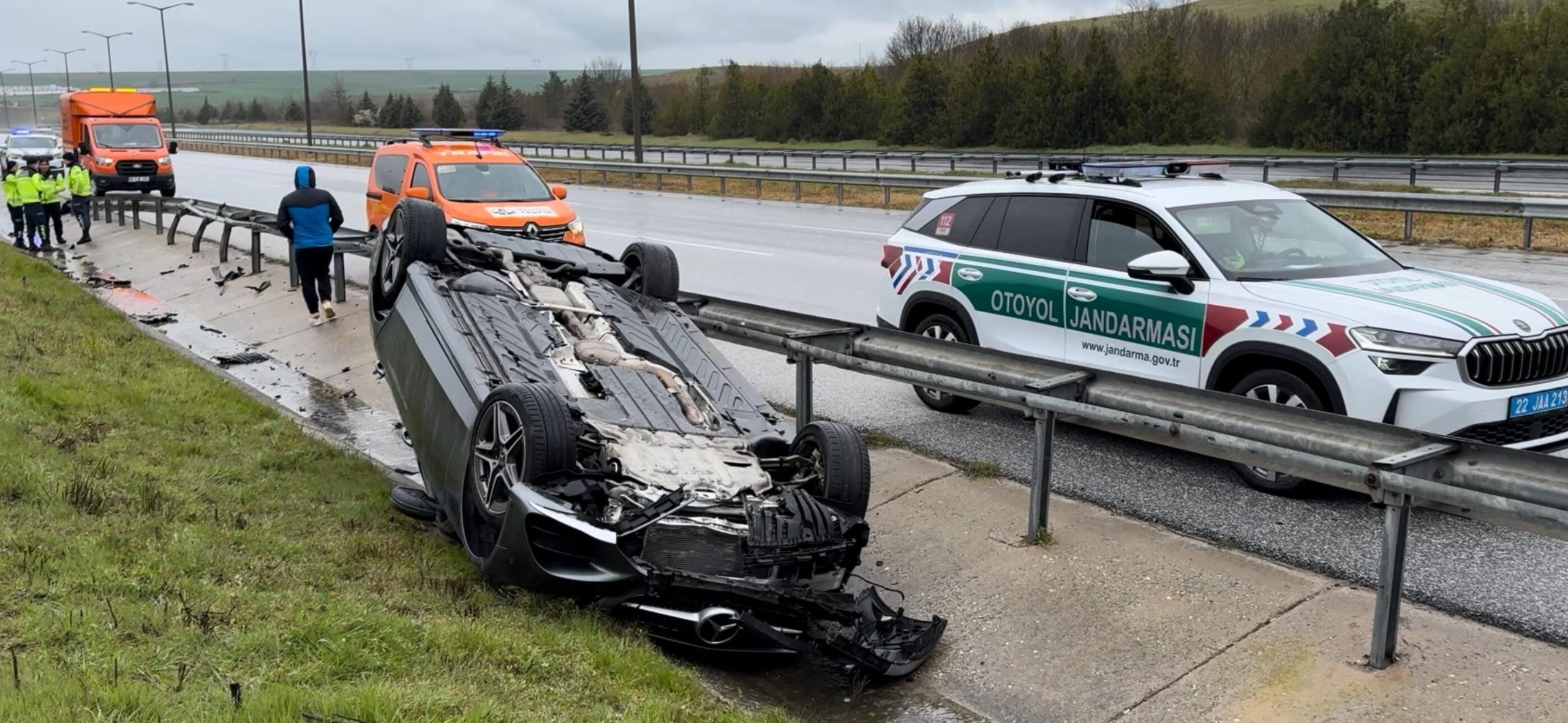 Edirne’den Kırklareli istikametine seyir halinde olan Mercedes marka 39 ADF 432 plakalı otomobil, Avrupa Otoyolu (E-80) Havsa Gişeleri yakınlarında şiddetli yağış nedeniyle kontrolden çıkarak takla attı. Sürücü H.E.’nin direksiyon hakimiyetini kaybetmesi sonucu bariyerlere çarparak ters dönen araç, yol kenarında durabildi. İhbar üzerine olay yerine hızla itfaiye, sağlık ve otoyol jandarma ekipleri sevk edildi.
