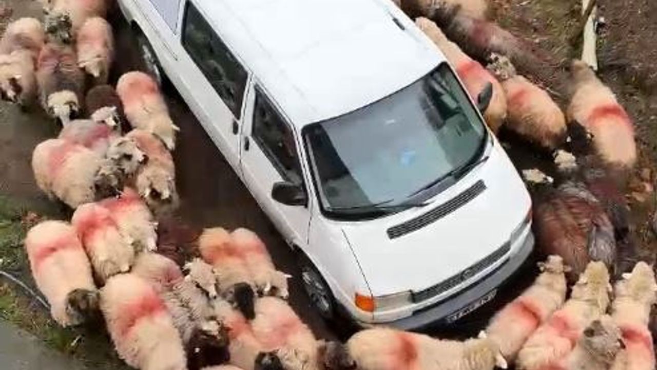 Minibüsün etrafında ilginç görüntü: Koyunlar dakikalarca döndü